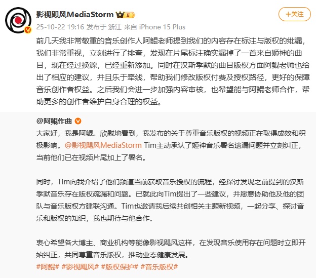 “前幾天我非常敬重的音樂(lè)創(chuàng)作人阿鯤老師提到我們的內(nèi)容存在標(biāo)注與版權(quán)的紕漏,我們非常重視,立刻進(jìn)行了排查,發(fā)現(xiàn)在片尾標(biāo)注確實(shí)漏掉了一首來(lái)自姬神的曲目,現(xiàn)在經(jīng)過(guò)換源,已經(jīng)重新添加。同時(shí)在漢斯季默的曲目版權(quán)方面阿鯤老師也給出了相應(yīng)的建議,并且樂(lè)于牽線(xiàn),幫助我們修改版權(quán)付費(fèi)及授權(quán)路徑,更好的保障音樂(lè)創(chuàng)作者權(quán)益。之后我們會(huì)進(jìn)一步加強(qiáng)內(nèi)容審核,也希望能與阿鯤老師合作,幫助更多的創(chuàng)作者維護(hù)自身合理的權(quán)益。”