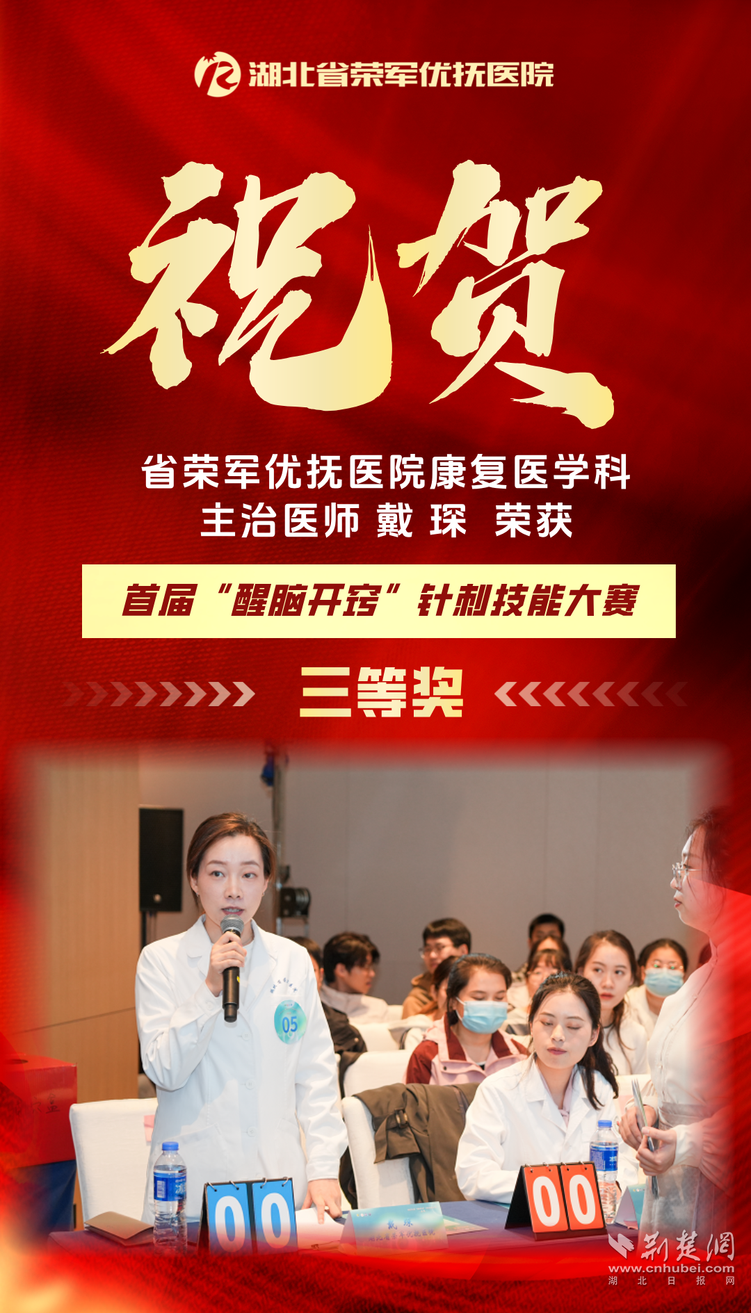 荊楚網(湖北日報網)訊(通訊員袁鳴)近日,首屆“醒腦開竅”針刺技能大賽在天津舉辦。湖北省榮軍優撫醫院康復醫學科主治醫師戴琛憑借扎實的理論功底與嫻熟的針刺手法,從全國眾多參賽選手中脫穎而出,榮獲大賽三等獎。
