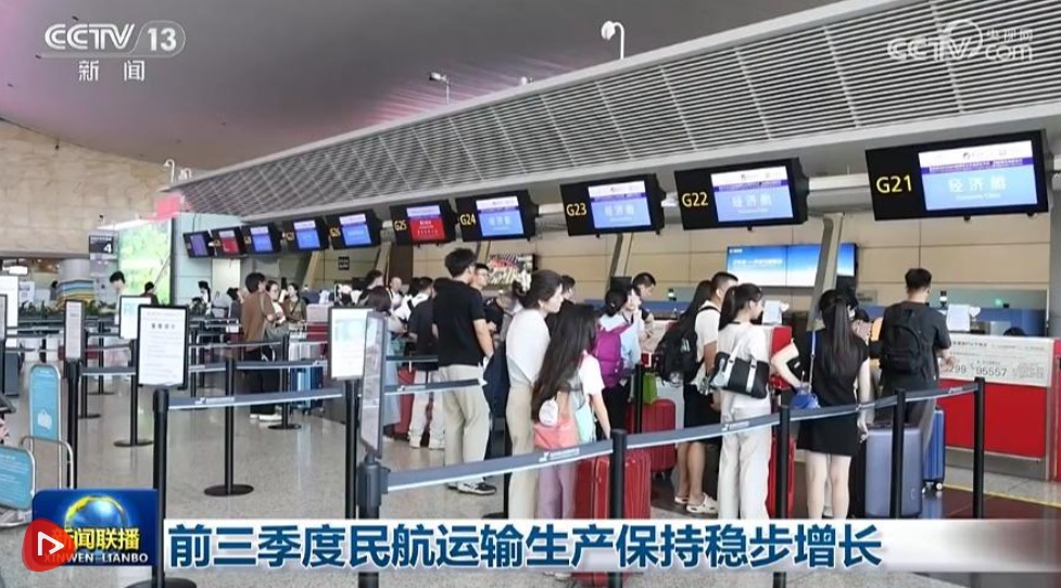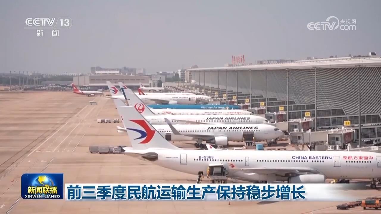 央視網消息(新聞聯播):記者從民航局了解到,今年前三季度民航運輸生產保持穩步增長。全行業完成運輸總周轉量、旅客運輸量、貨郵運輸量同比分別增長10.3%、5.2%和14%。