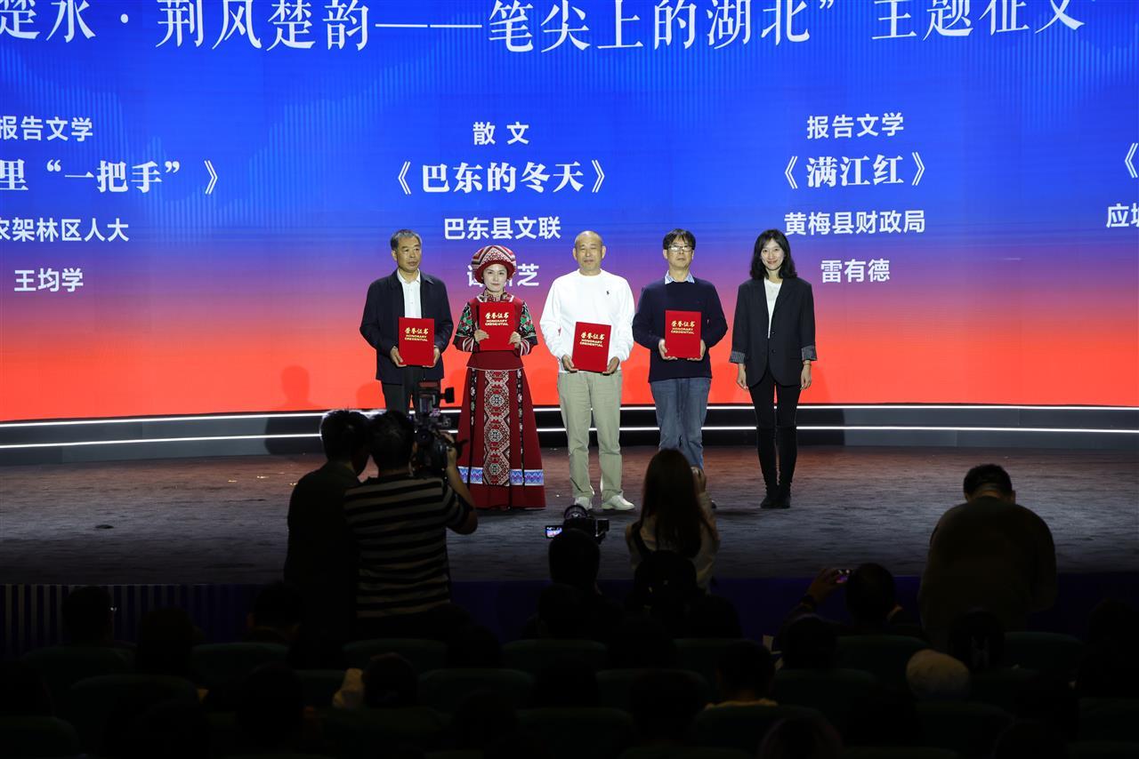 晚會現場,還發布了由湖北省作家協會主辦的“荊山楚水?荊風楚韻——筆尖上的湖北”主題征文活動優秀作品。征文啟動以來,吸引全國文學愛好者踴躍參與,共收到投稿1842篇,經評審,最終評出一等獎4名、二等獎10名、三等獎20名、優秀獎50名。作品題材廣泛、風格多樣,涵蓋生態文明、鄉村振興、城市記憶、文化傳承等多個領域,生動書寫新時代的荊楚故事與人民心聲。