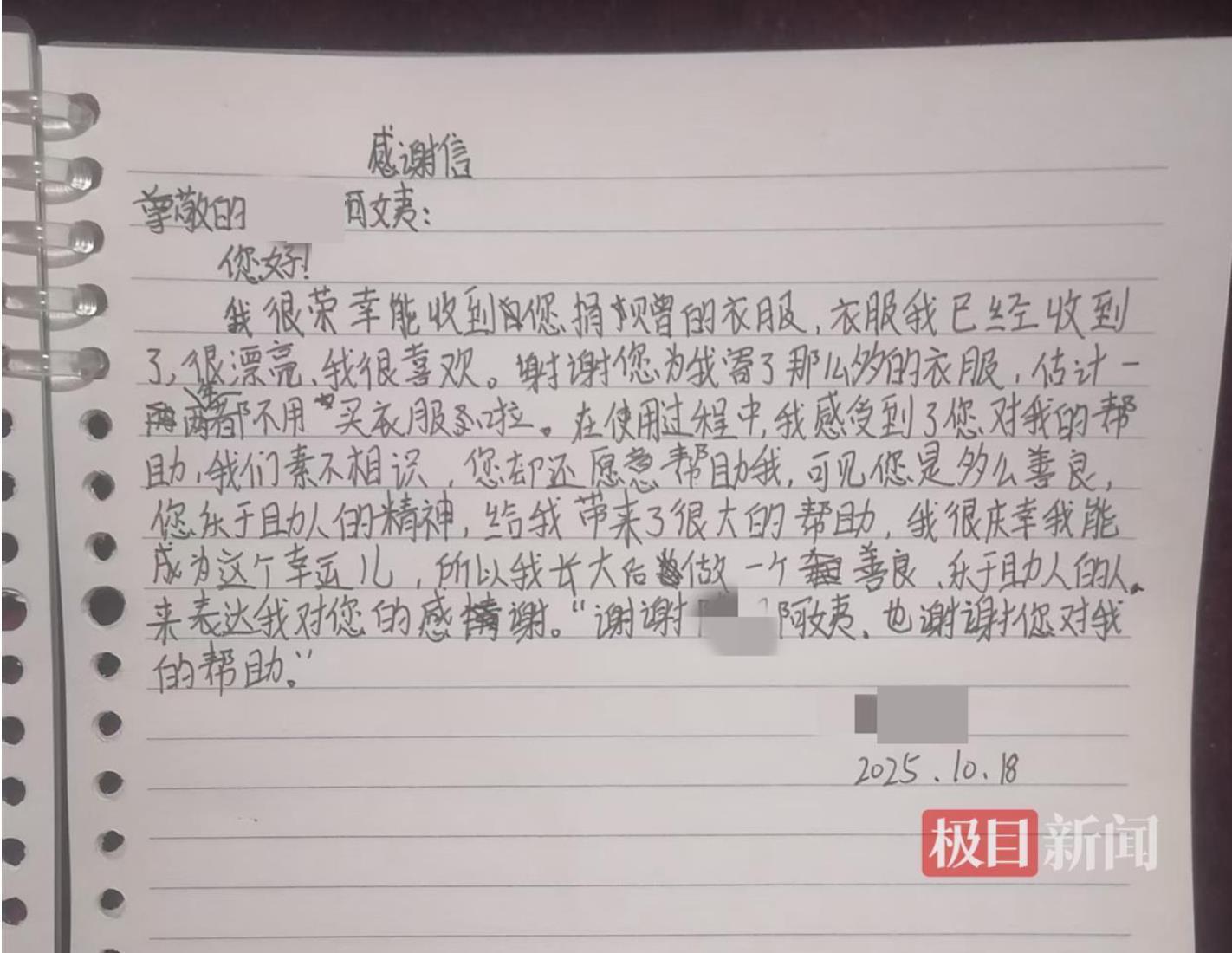 視頻中女孩穿著她送的衣服,笑著說道:“感謝阿姨”,信中寫道:“您樂于助人的精神,給我帶來了很大的幫助,我很慶幸能成為這個幸運兒,所以我長大后要做一個善良、樂于助人的人。”