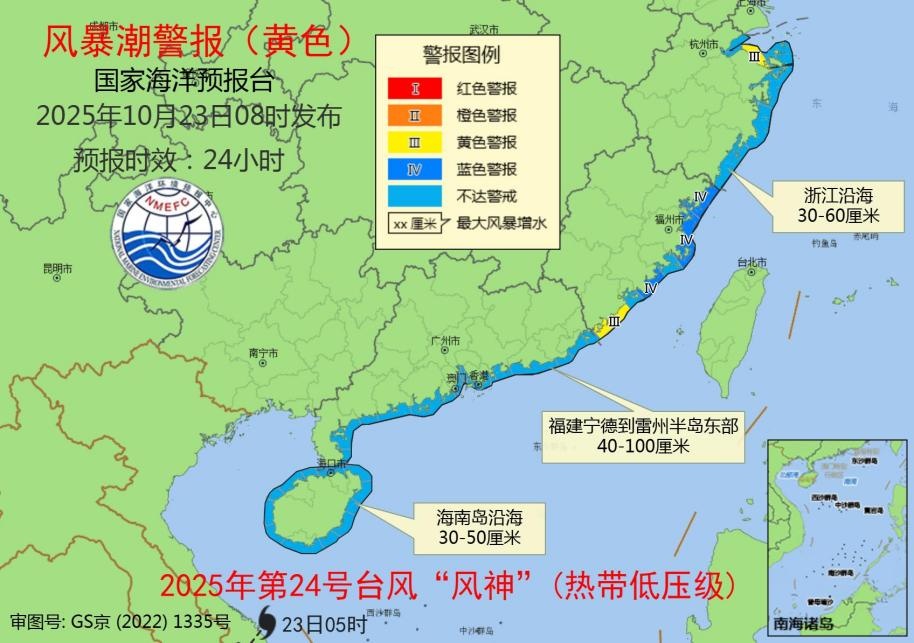預(yù)計(jì)10月23日白天,浙江沿海將出現(xiàn)30到60厘米的風(fēng)暴增水,福建寧德到廣東雷州半島東部沿海將出現(xiàn)40到100厘米的風(fēng)暴增水,海南島沿海將出現(xiàn)30到50厘米的風(fēng)暴增水。浙江省寧波市和福建省漳州市的風(fēng)暴潮預(yù)警級別為黃色。