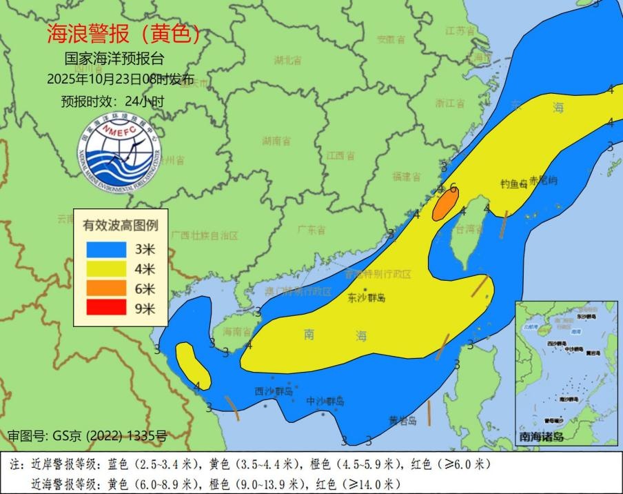 受強(qiáng)冷空氣的影響,預(yù)計(jì)10月23日上午到24日上午,東海南部、臺灣海峽、南海北部將出現(xiàn)4到6米的巨浪到狂浪區(qū),近海海域海浪預(yù)警級別為黃色;浙江南部、福建、海南東部近岸海域?qū)⒊霈F(xiàn)3到4.4米的大浪到巨浪,該近岸海域海浪預(yù)警級別為黃色。