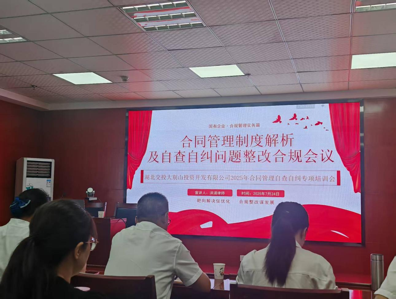合同管理是風險防控的重中之重,7月24日,湖北交投大別山投資開發有限公司舉辦合同管理與招采管理專題培訓,黨委委員、副總經理姜國權主持開班,投資發展部組織合同全流程與招采規范授課;10月15日,該公司再次聯合湖北立豐律師事務所洪涵律師開展法務知識培訓,圍繞《民法典》及典型案例深入講解合同簽訂、履行、訴訟等關鍵環節。年內累計開展多輪培訓,參訓人員達150人次,顯著提升業務人員的風險識別與合規操作能力,從源頭筑牢合同風險屏障。