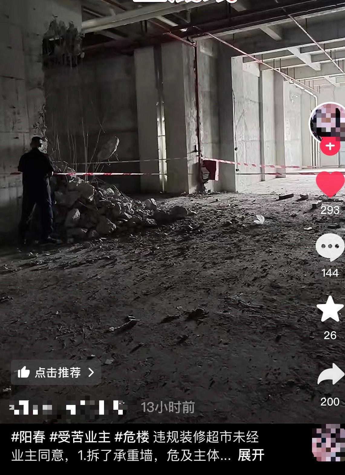 10月22日,多名網友發視頻稱,廣東省陽春市春城街道辦興華社區尚品星寓小區有商戶裝修時拆除承重墻,引發關注。視頻中,可見有鋼筋混凝土的墻體被拆,還有工程器械在場。