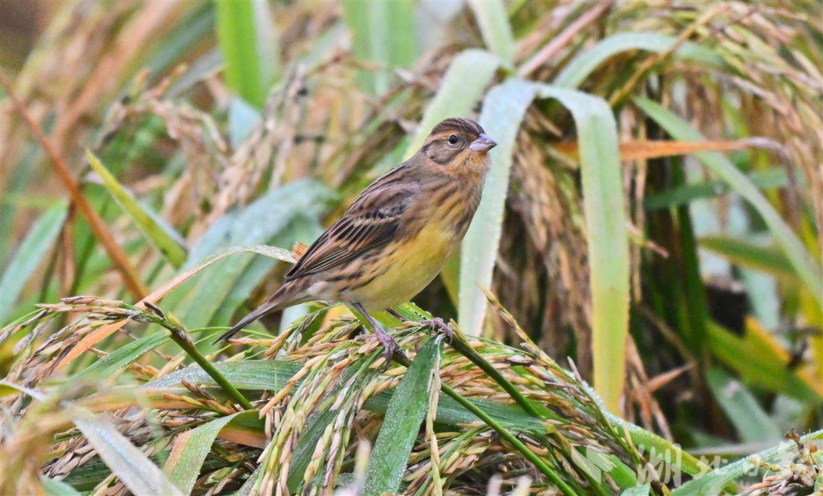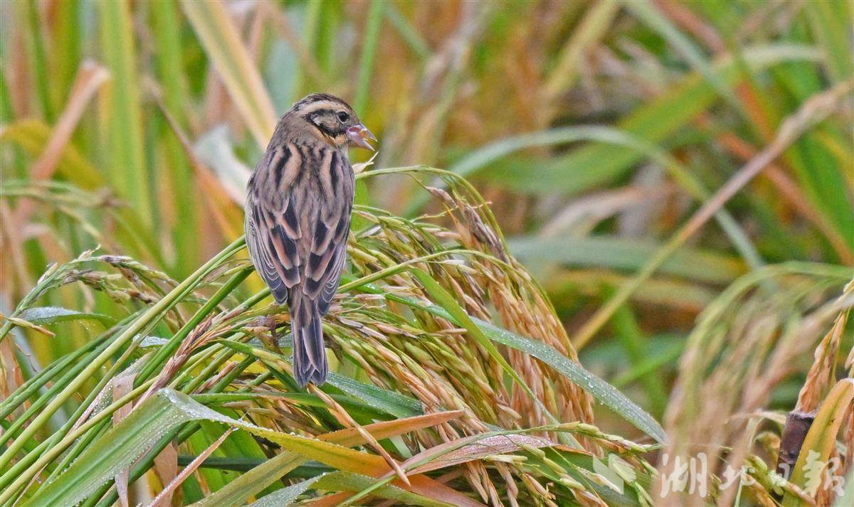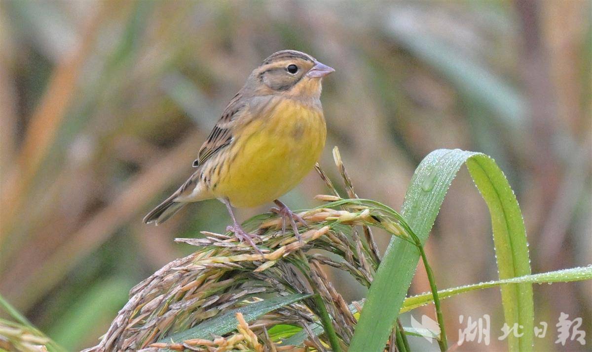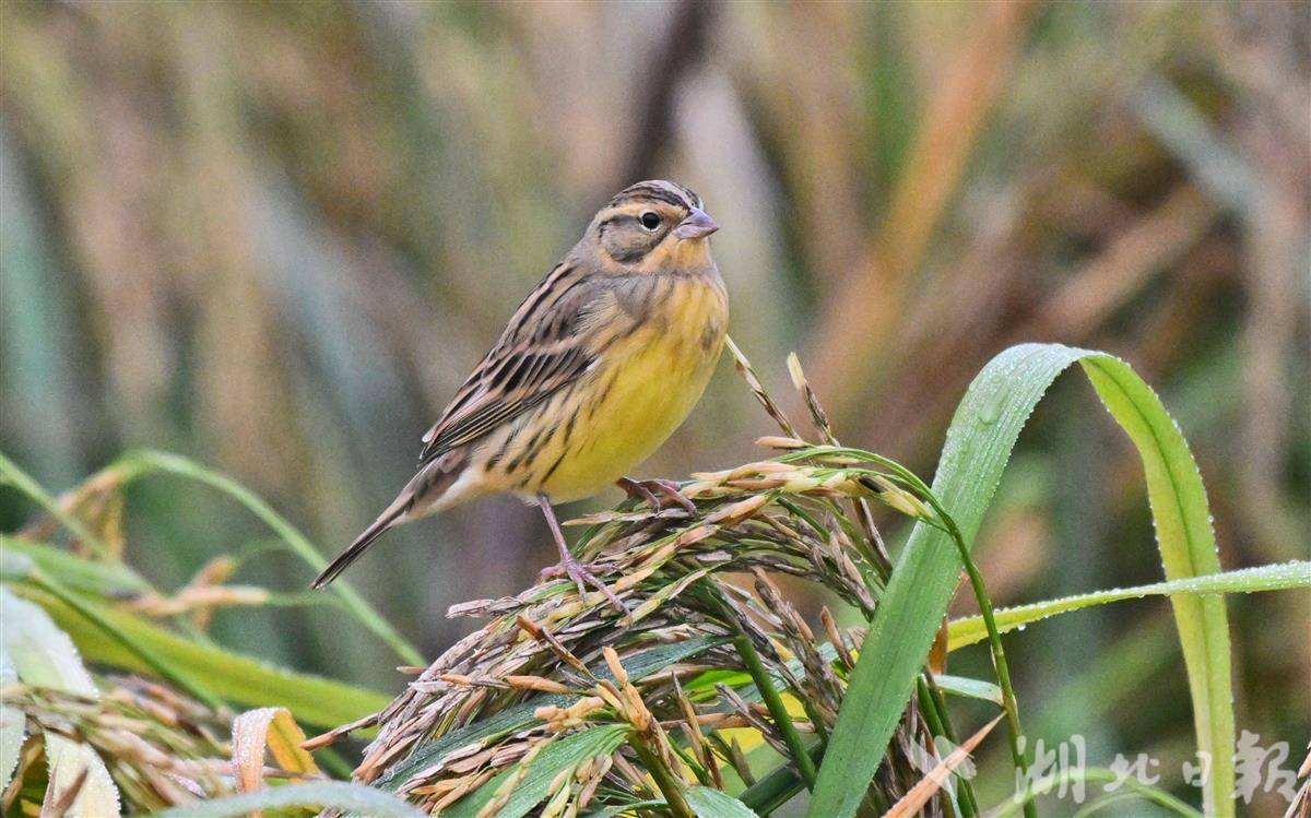 10月23日,記者于宜昌市卷橋河濕地一片觀賞性稻田中,拍攝到國家一級重點保護野生鳥類——黃胸鹀(俗稱“禾花雀”)。該鳥屬于典型的河谷草甸灌叢草地鳥類。黃胸鹀于2017年被世界自然保護聯盟提升為“極危”等級,2021年起被正式列為中國國家一級重點保護野生動物。近年來,宜昌市持續推進濕地生態保護與修復,全市濕地面積達8.24萬公頃。卷橋河濕地通過植物修復、生物清淤及自然護坡等措施,重構了健康穩定的岸線生態系統,該濕地已連續四年觀測到成群的黃胸鹀在遷徙途中經停此地。(湖北日報全媒記者 劉曙松 攝)