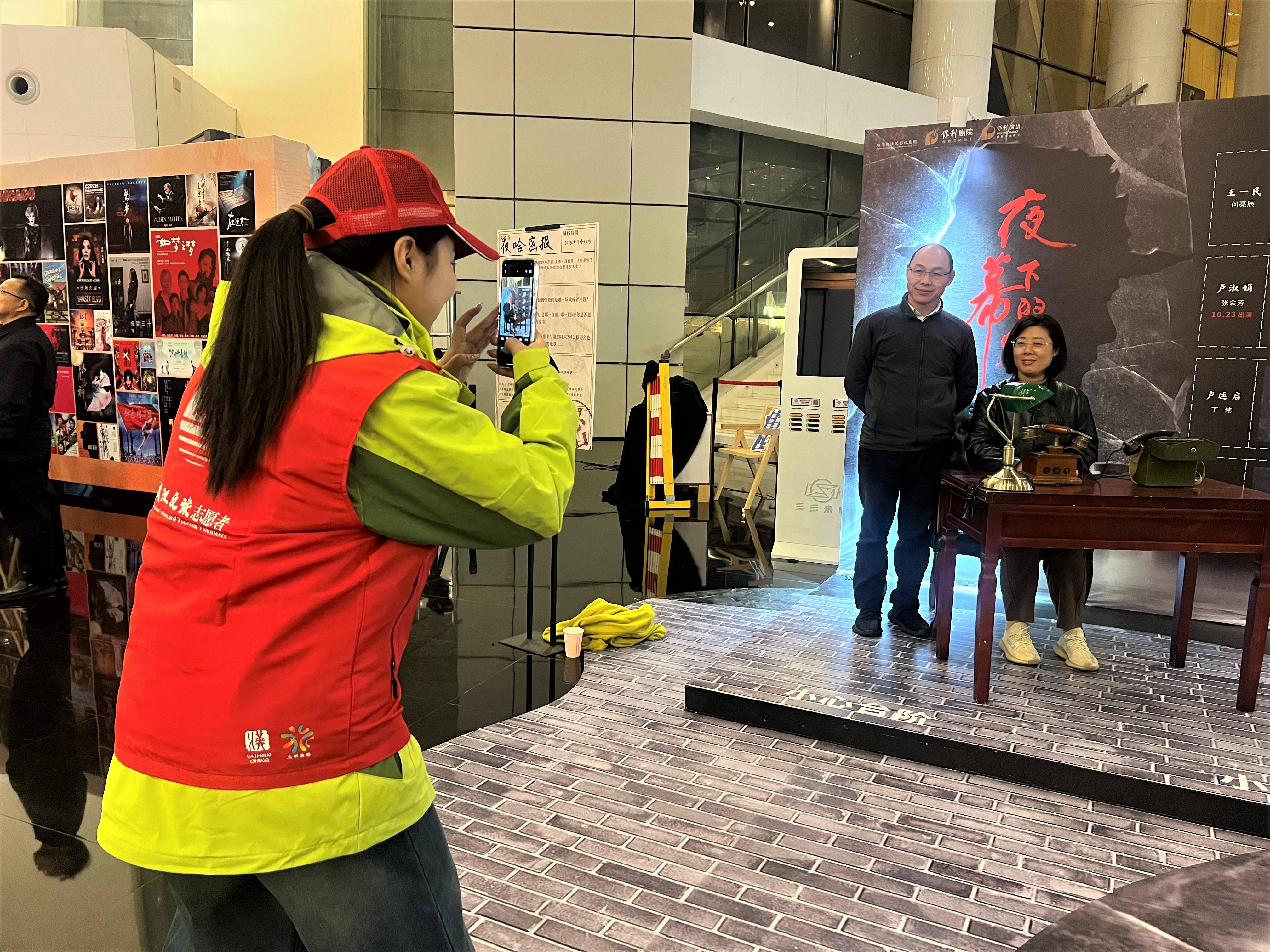 大廳放有一張根據(jù)《夜幕下的哈爾濱》場景還原的桌子,上面放有舊式電話、臺燈等,營造出復(fù)古氛圍,引起很多觀眾的青睞,紛紛上前拍照打卡。志愿者們接過觀眾的手機(jī)變身“攝影師”,認(rèn)真地調(diào)整角度,幫他們定格這珍貴的記憶。