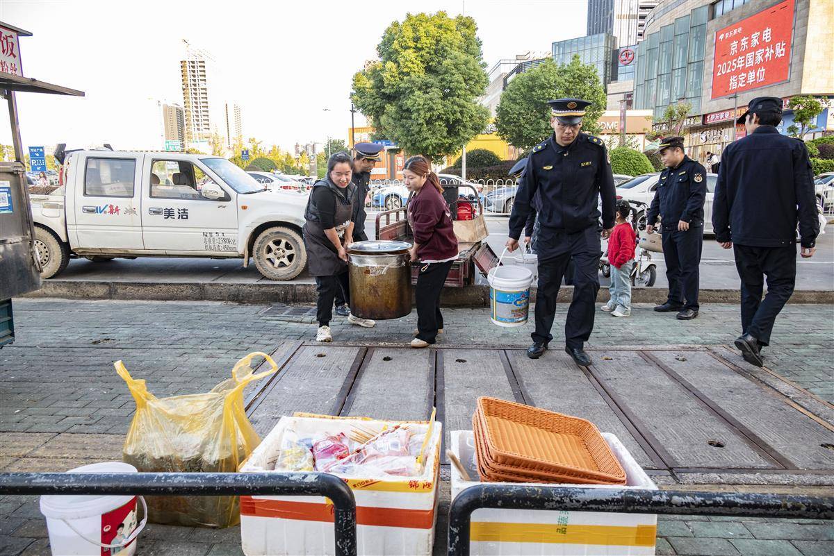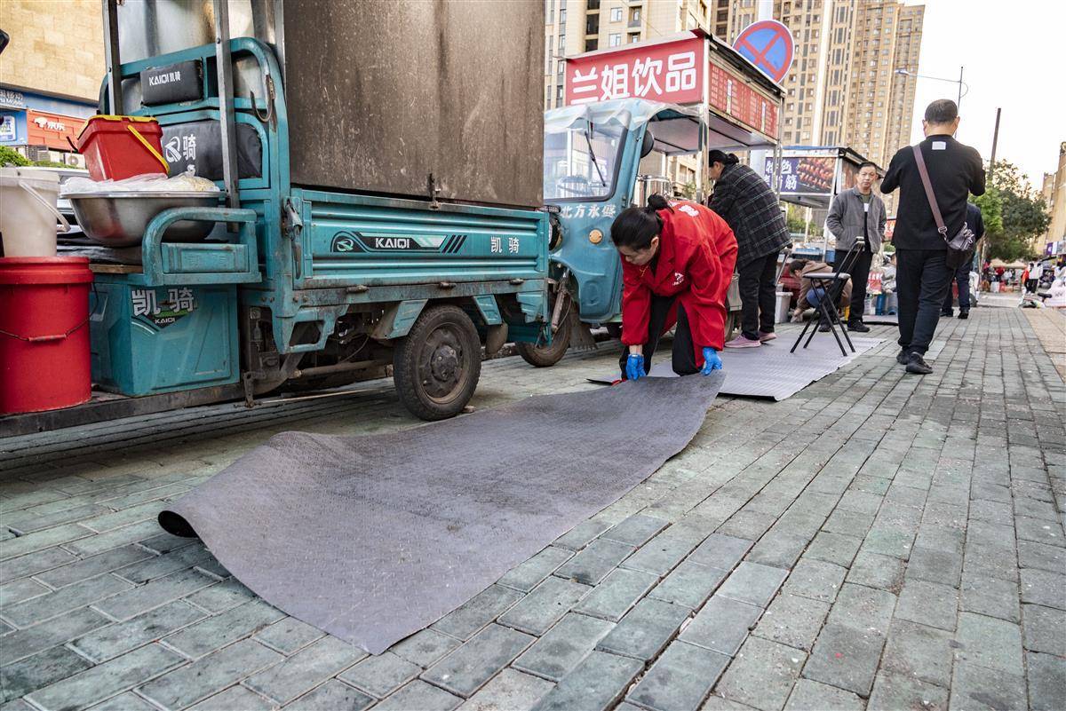 他們提出標配“三個一”措施,即要求每個攤販配齊一套掃把簸箕、一套分類垃圾桶以及一套有效的防污墊。尤為暖心的是,黃陂區城管局統一采購并定制了標準防油污地墊,免費發放給攤主使用,還現場指導鋪設,確保整齊劃一、有效防污。很快,曾經臟亂的地面和斑駁的油污便不見了蹤影,整條街道展現出干凈整潔的新面貌。