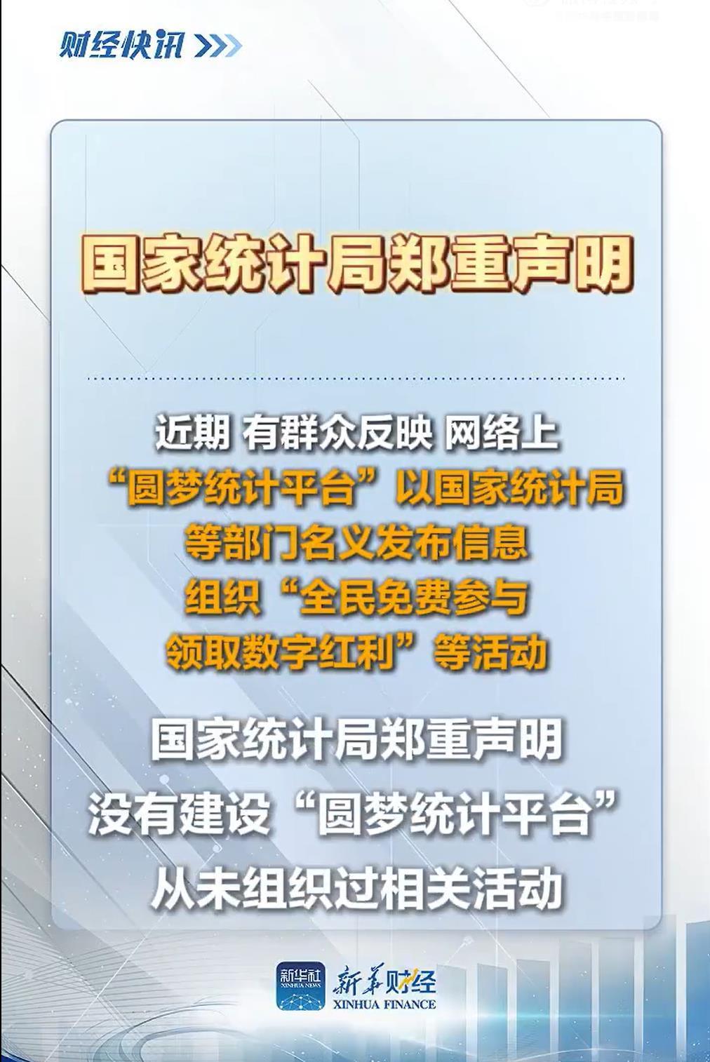 國家統計局10月23日發布鄭重聲明:近期,有群眾反映,網絡上“圓夢統計平臺”以國家統計局等部門名義發布信息,組織“全民免費參與 領取數字紅利”等活動。在此,我們鄭重聲明,國家統計局沒有建設“圓夢統計平臺”,從未組織過相關活動。請各地方和廣大群眾提高警惕,謹防上當受騙。如已造成損失,及時向公安部門舉報案件線索。我局保留采取相應法律手段的權利。