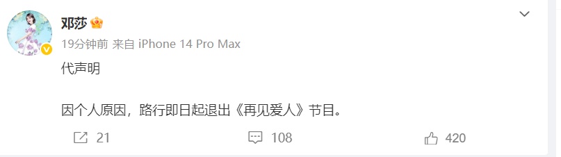 演員鄧莎當天代發聲明稱,其丈夫路行因個人原因,即日起退出《再見愛人》節目。節目官方隨后確認,本期節目將按計劃上線。