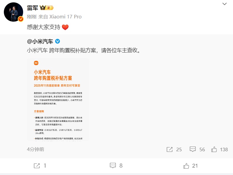 小米方面表示,凡在2025年11月30日24時前完成鎖單,因小米汽車生產、運輸等原因導致車輛需到2026年完成開票交付的用戶,可享受“跨年購置稅補貼”。