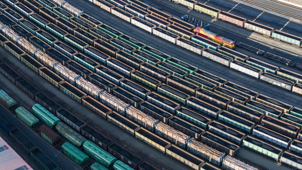 2025年10月18日,在中國鐵路哈爾濱局集團有限公司綏芬河站南場,滿載進口貨物的列車等待解體換裝(無人機照片)。新華社發(曲藝偉 攝)