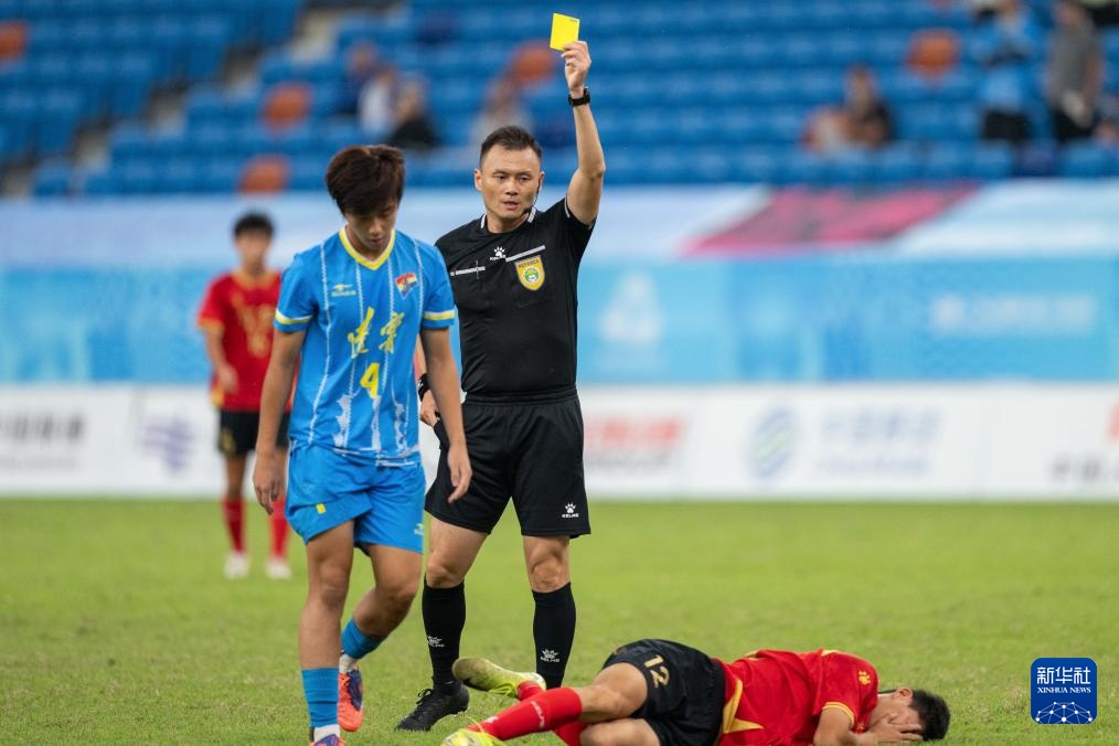 10月23日,主裁判張楊帆(中)在比賽中向遼寧隊球員鄭偉杰(左)出示黃牌。