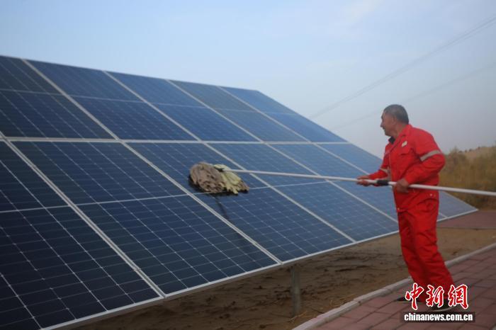 在塔里木沙漠公路48號(hào)井,看護(hù)員清理太陽(yáng)能板上的沙塵。陶拴科 攝