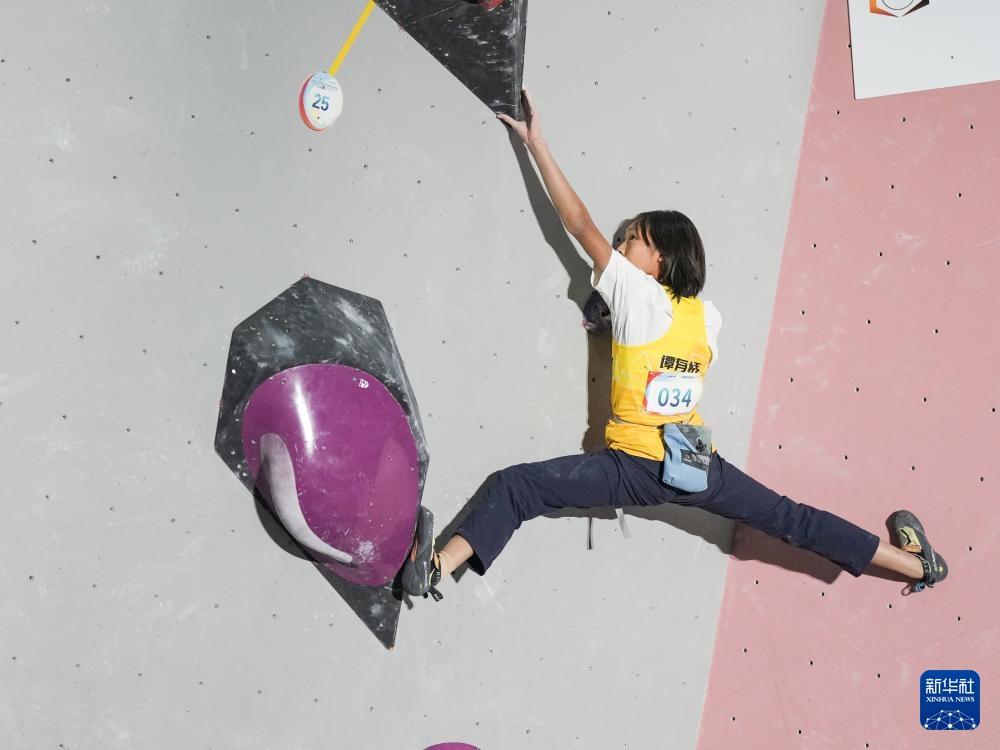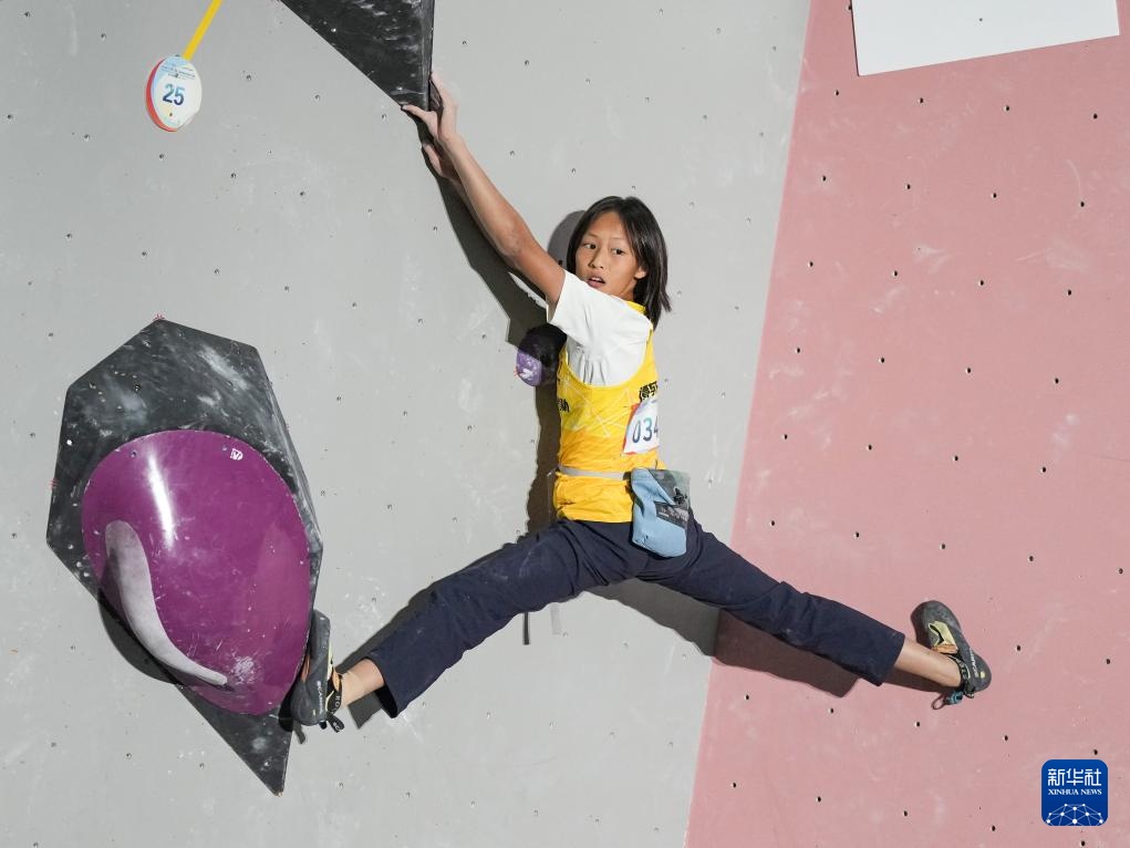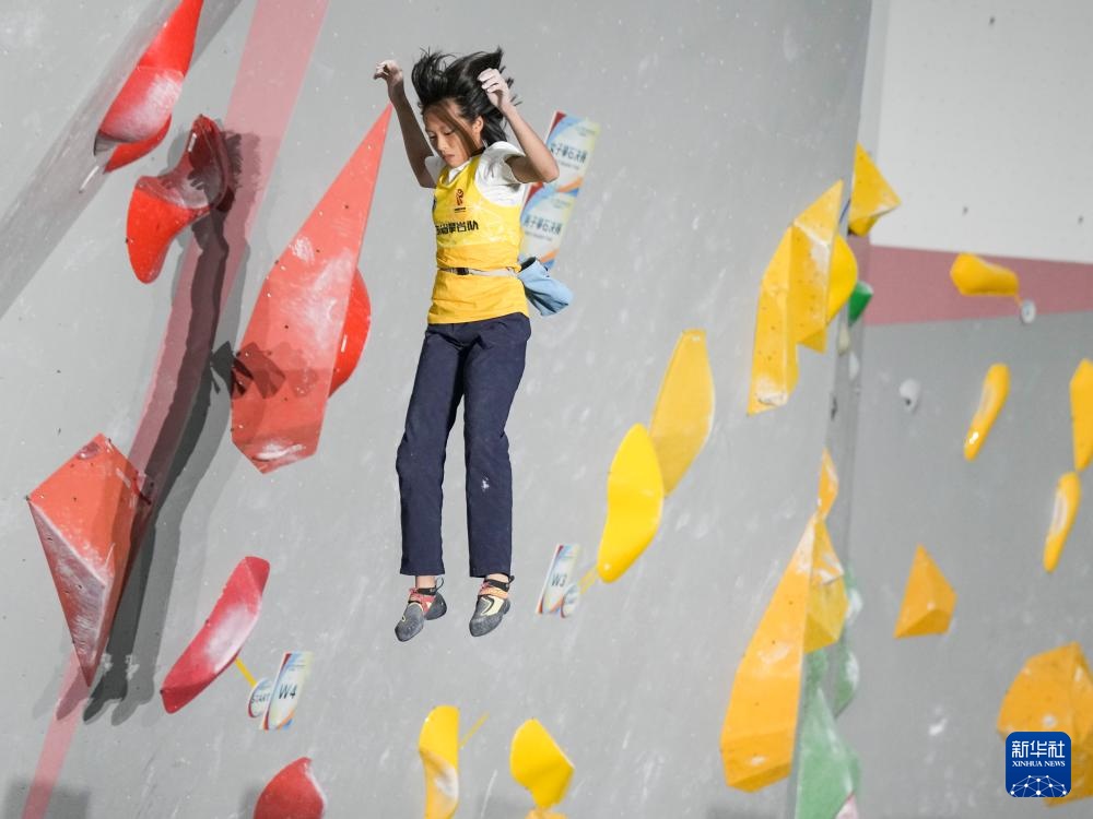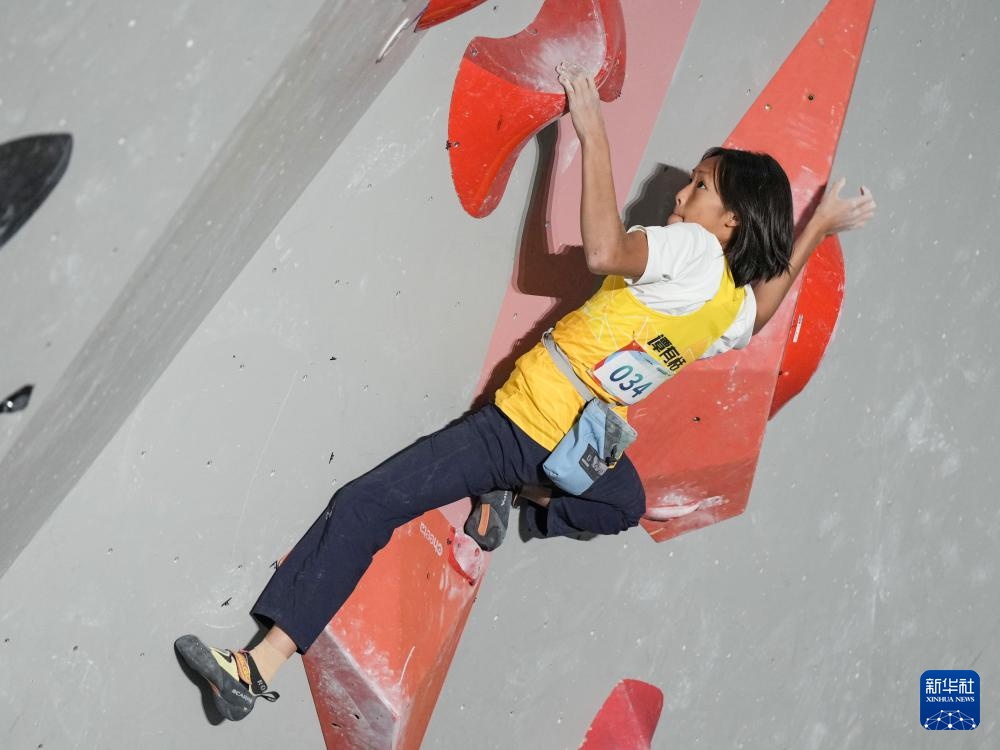10月24日,廣東省攀巖隊(duì)選手譚有恬在比賽中。最終,她獲得冠軍。