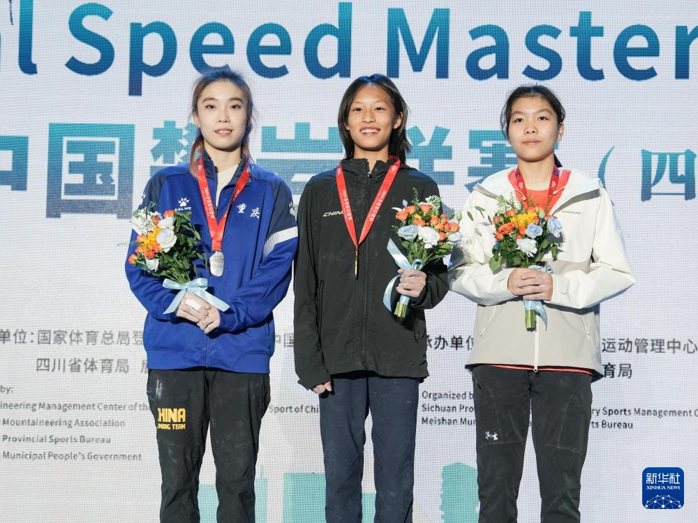 10月24日,冠軍廣東省攀巖隊(duì)選手譚有恬(中)、亞軍重慶市攀巖隊(duì)選手李婧瑜(左)和季軍浙江省攀巖隊(duì)選手蔣晨曦在頒獎(jiǎng)儀式上。