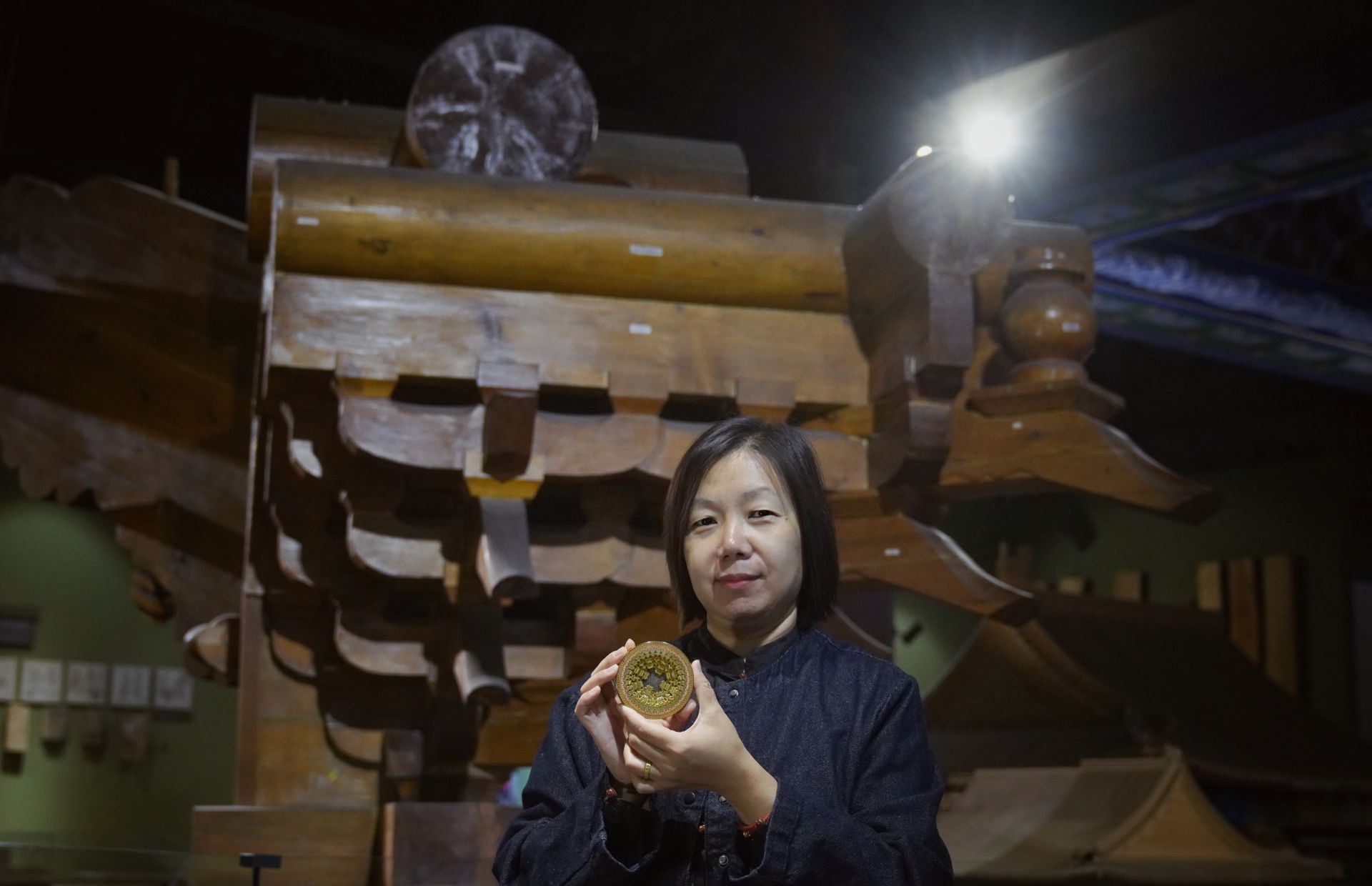 北京古代建筑博物館游覽文物保護與發展部高級工藝美術師周海榮展示天宮藻井冰箱貼。新京報記者 薛珺 攝