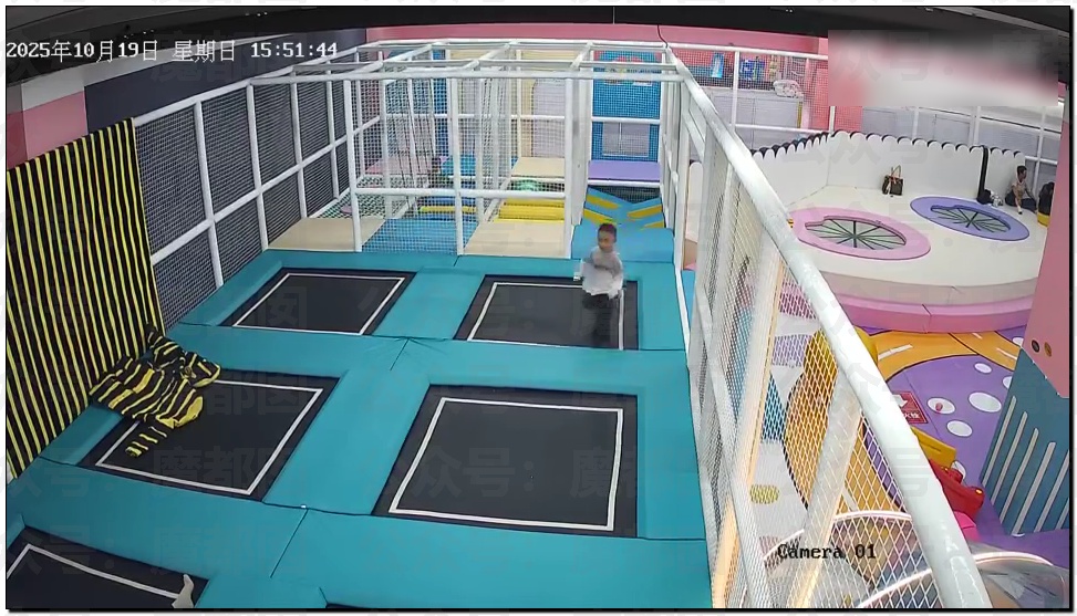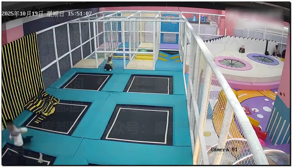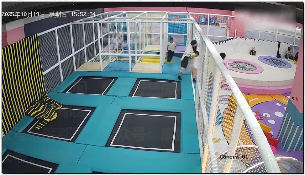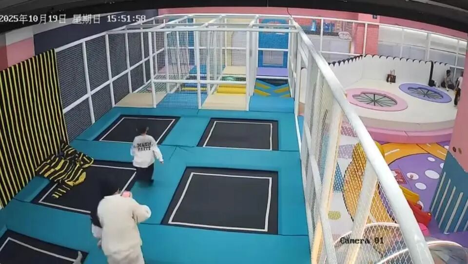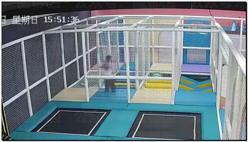 據(jù)網(wǎng)友發(fā)布的事發(fā)時游樂場內(nèi)的監(jiān)控錄像顯示,10月19日下午3時49分,兩名孩子在蹦床游樂區(qū)內(nèi)追逐玩鬧。
