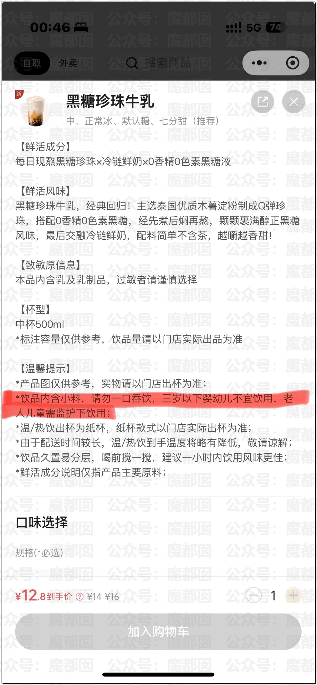 記者注意到,該奶茶店的下單小程序中,珍珠奶茶類產(chǎn)品均有提示語:“溫馨提示,飲品內(nèi)含小料,請勿一口吞飲,三歲以下嬰幼兒不宜食用,老人兒童需監(jiān)護(hù)下飲用。”