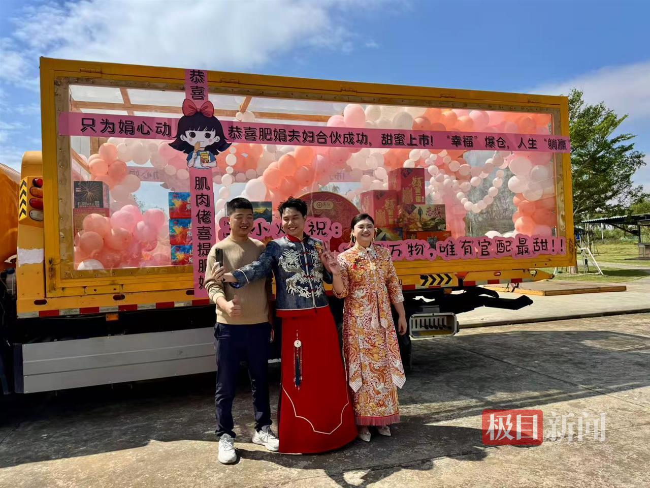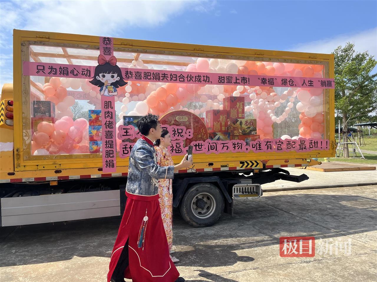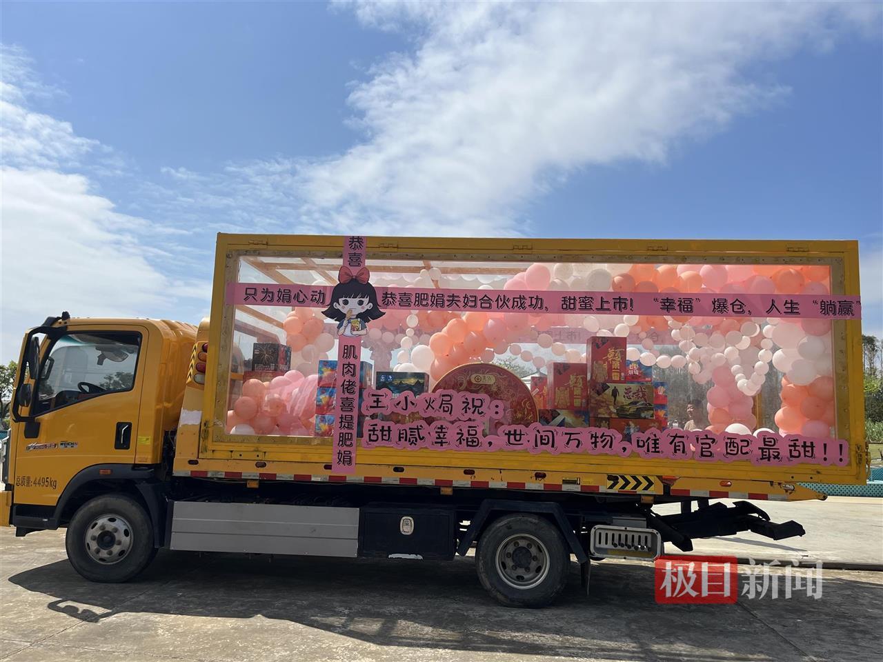 現(xiàn)場(chǎng)一輛滿載氣球和煙花的小貨車格外引人注目,車身上寫著:“恭喜肥娟夫婦合伙成功,甜蜜上市!‘幸福’爆倉,人生‘躺贏’”。這份特別的賀禮來自網(wǎng)友王小焗。他告訴記者,自己被“肥娟”夫婦的真誠打動(dòng),特地清空了煙花店的倉庫,備齊了白天、夜晚都能放的煙花和鞭炮,“裝了一車,滿滿的愛。”