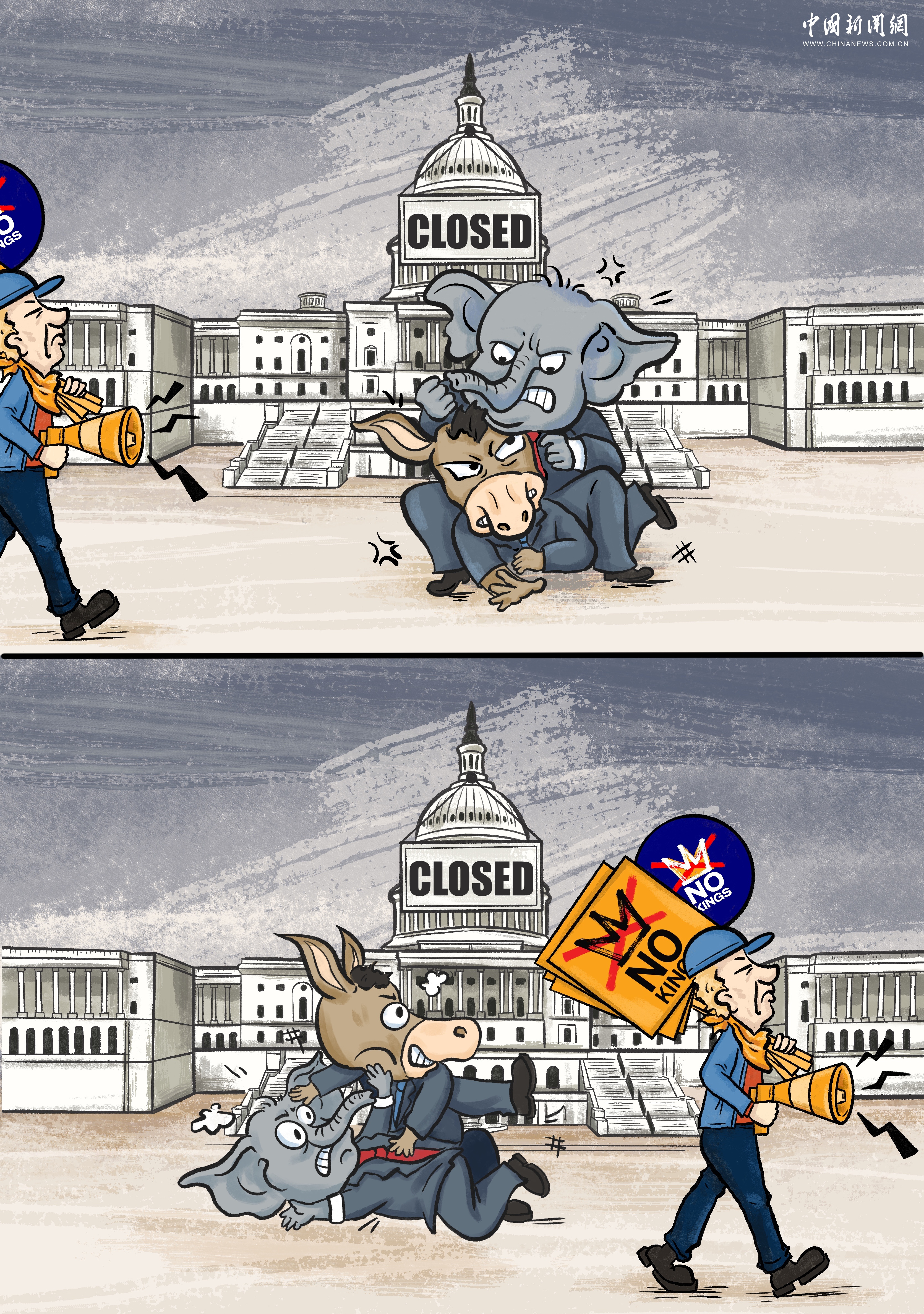 當(dāng)舉著“No Kings”標(biāo)語的民眾漠然路過時(shí),爭(zhēng)斗中的驢與象似乎才短暫地停下,驚覺真正的議題早已不是彼此間的勝負(fù)——而是那扇高懸著“關(guān)門”牌子、對(duì)沸騰民意關(guān)閉的聯(lián)邦政府大門。