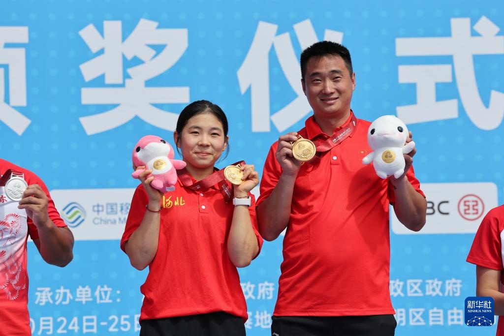 10月25日,冠軍河北隊選手孫思蓓(左)和教練在頒獎儀式上。