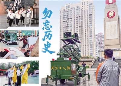 武漢市二中廣雅中學學生進行防空疏散演練 學生模擬就地掩體躲避 學生開展防化演練 漢口江灘的武漢防汛紀念碑前,移動式升降電聲警報車拉響