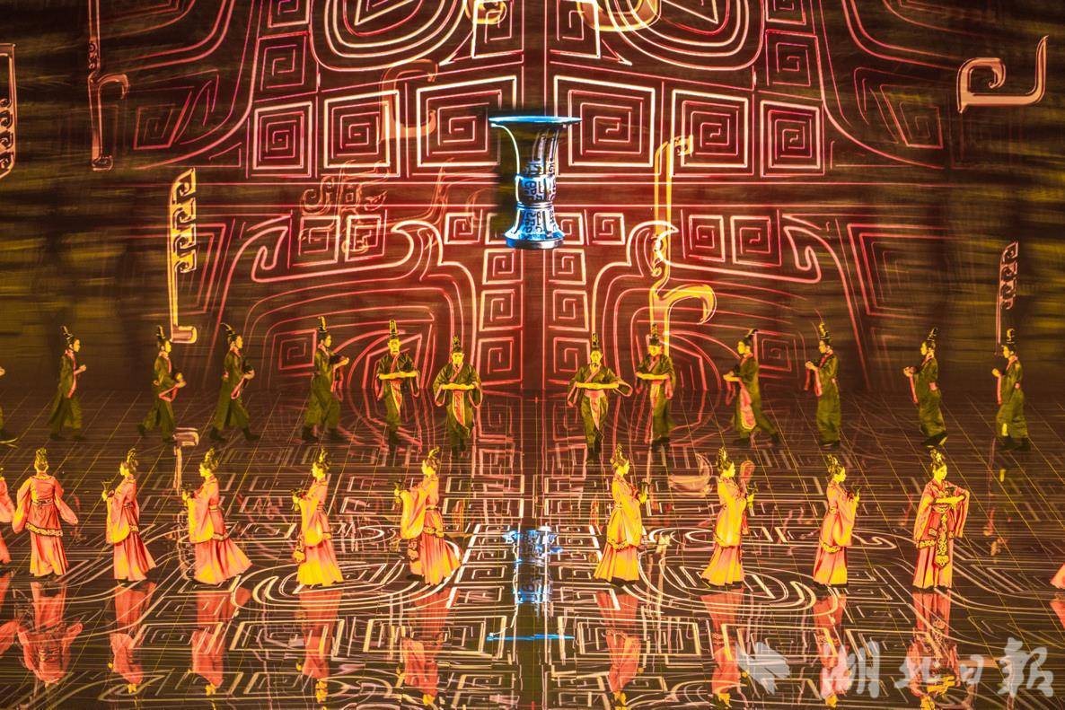 舞臺(tái)大屏上,武漢最早的原住民——“漢陽人”九鳳從遠(yuǎn)古走來、翩翩起舞,國寶級(jí)文物商代青銅器“天獸御尊”與“軒轅造車”的車輪交替呈現(xiàn),三國甲士大軍山下?lián)]戈征戰(zhàn)……文藝演出的序幕《江漢長歌》,追溯中國車谷歷史文化之源。