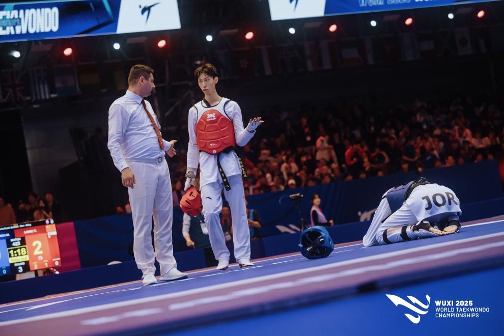 在男子63公斤級四分之一決賽中,世錦賽冠軍梁育帥迎戰約旦選手阿爾塔里耶赫。首局梁育帥進入狀態較慢,以1:13告負。第二局他穩住節奏,在關鍵時刻用一記高位橫踢絕殺,以14:12扳平比分。決勝局中,梁育帥率先得分,在雙方近身對抗時,約旦選手突然倒地。裁判認定梁育帥用拳擊頭犯規,對手無法繼續比賽,梁育帥被判負,無緣四強。