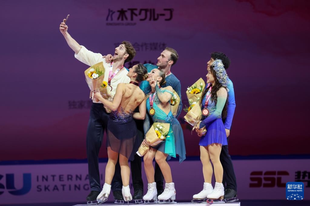 10月25日,冠軍格魯吉亞組合阿納斯塔西婭·梅特爾基娜(前左二)/盧卡·別魯拉瓦(后右)、亞軍意大利組合薩拉·孔蒂(前左一)/尼科洛·馬西(后左)和季軍中國組合隋文靜(右二)/韓聰在頒獎儀式上自拍合影。