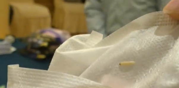 當著蘇菲品牌方負責人的面,記者現場隨機打開一包霍女士購買的且未拆封的蘇菲安心褲,發現里面也出現了活蟲。親眼看到這一幕,蘇菲品牌方負責人鞠躬道歉并表示這個蟲是印度谷螟,生存期是2周到4周。品牌方也感到震驚,稱將對其進行檢測并及時反饋檢測結果。