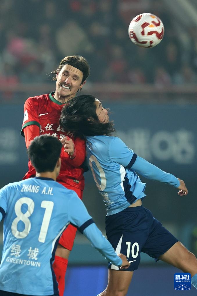 10月25日,河南俱樂部酒祖杜康隊球員邁達納(上左)與浙江俱樂部綠城隊球員李提香(上右)在比賽中爭頂。