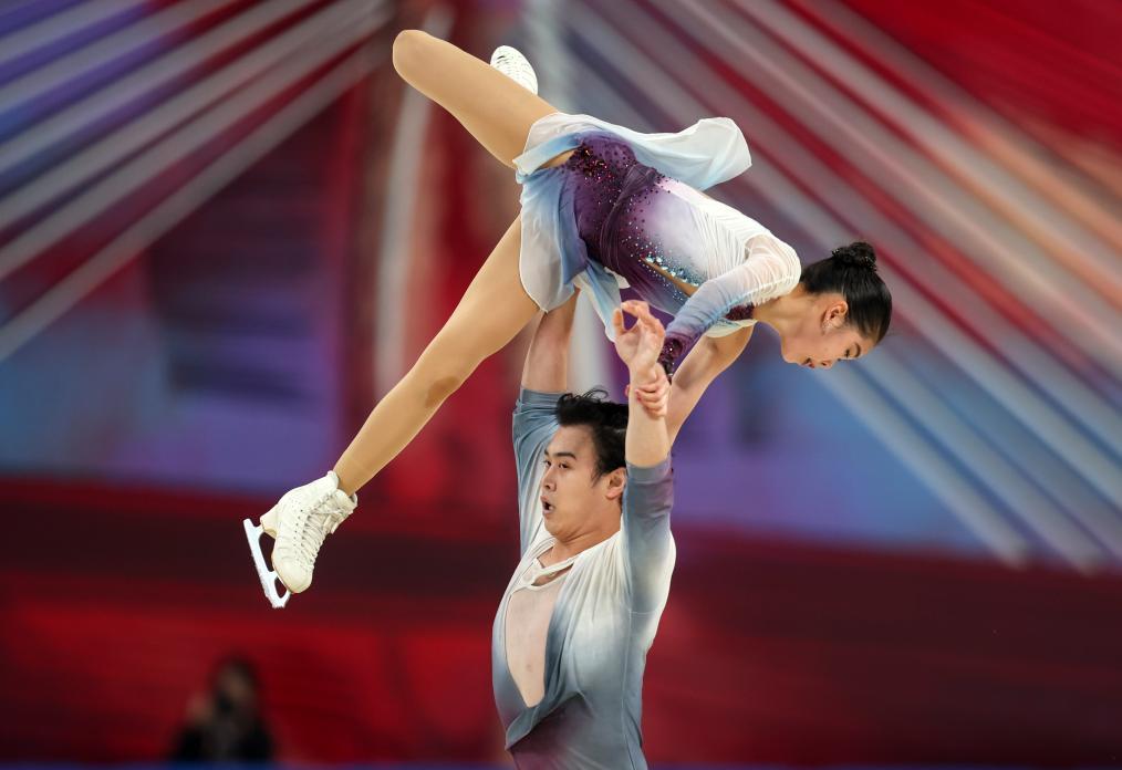 10月25日,中國組合張嘉軒(上)/黃一航在自由滑比賽中。最終,他們獲得雙人滑比賽第四名。