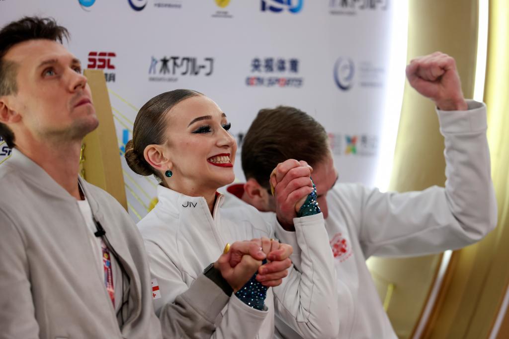 10月25日,格魯吉亞組合阿納斯塔西婭·梅特爾基娜(中)/盧卡·別魯拉瓦(右)在等分席慶祝奪得雙人滑比賽冠軍。