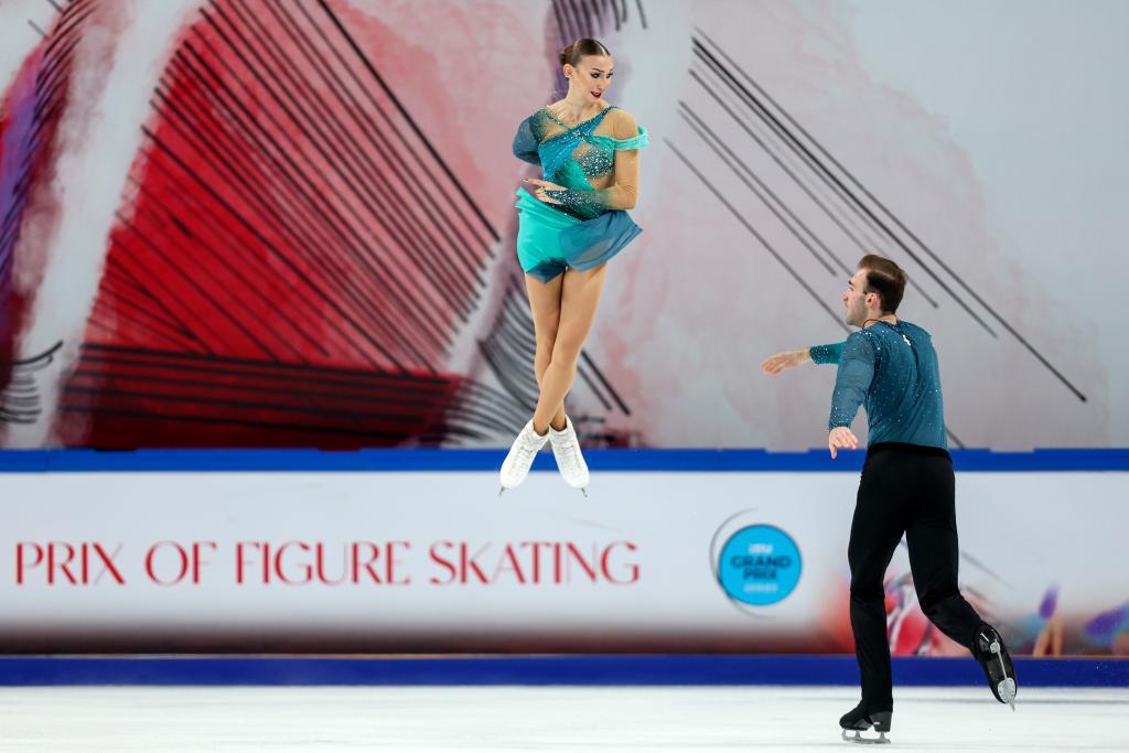 10月25日,格魯吉亞組合阿納斯塔西婭·梅特爾基娜(右)/盧卡·別魯拉瓦在自由滑比賽中。最終,他們奪得雙人滑比賽冠軍。