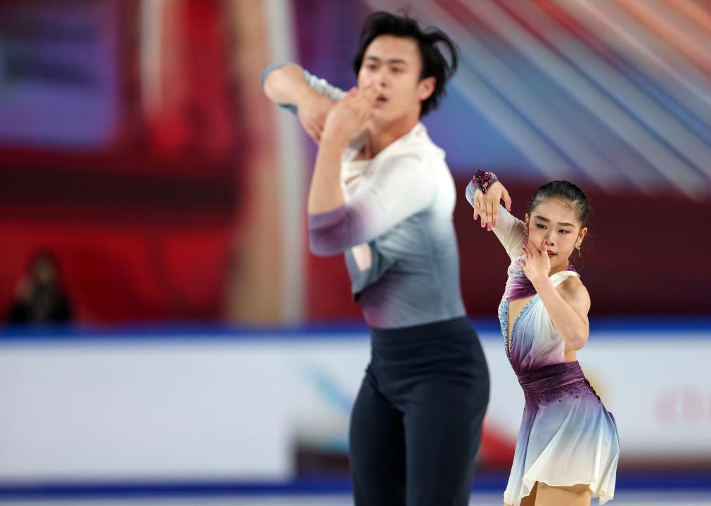 10月25日,中國組合張嘉軒(右)/黃一航在自由滑比賽中。最終,他們獲得雙人滑比賽第四名。