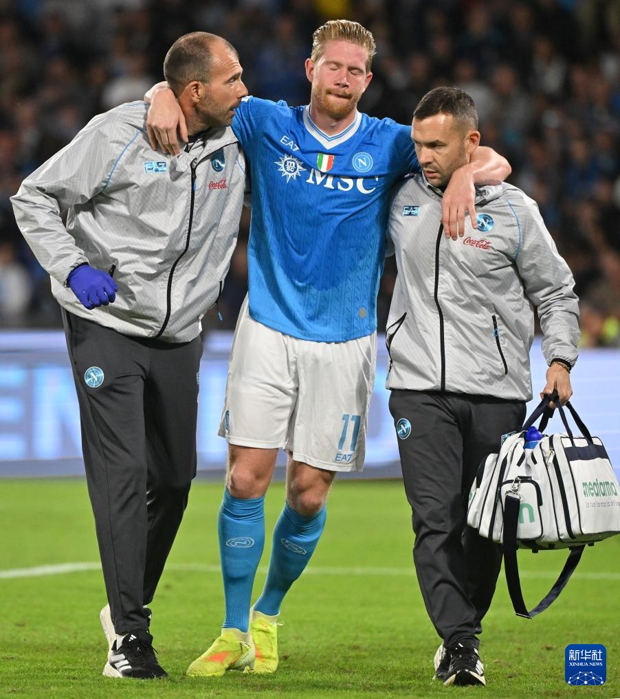 10月25日,那不勒斯隊球員德布勞內(中)在射入點球后受傷離場。
