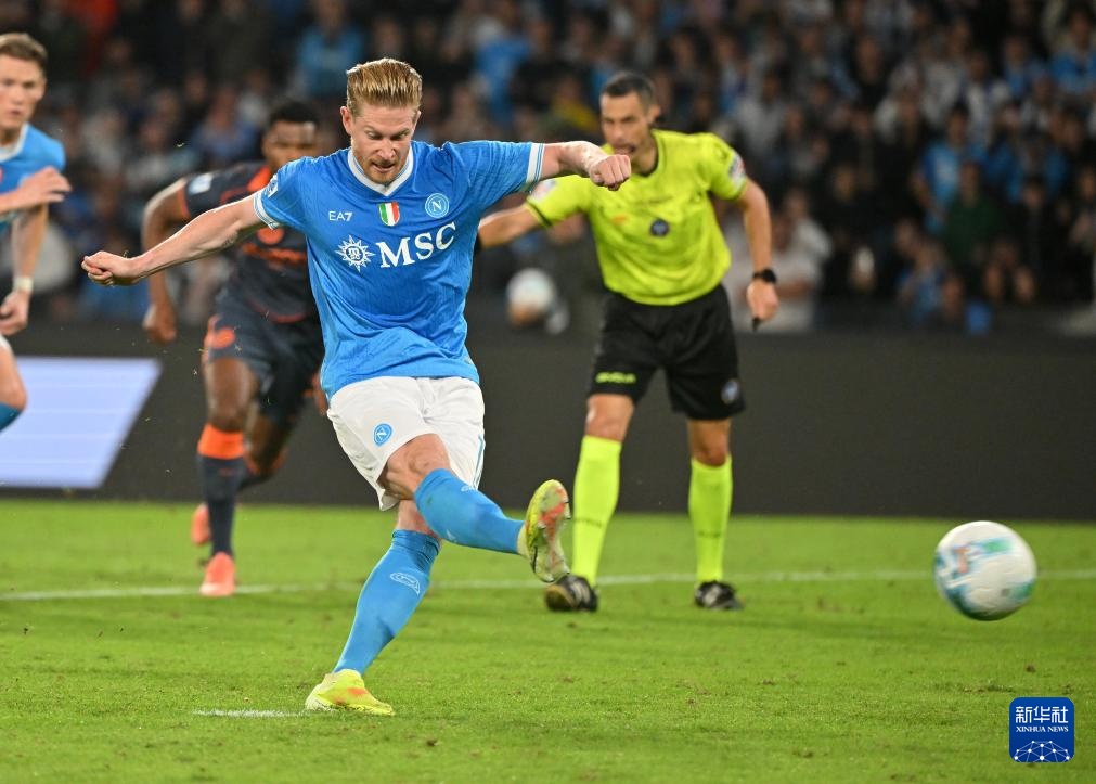10月25日,那不勒斯隊球員德布勞內(右三)在比賽中射入點球。