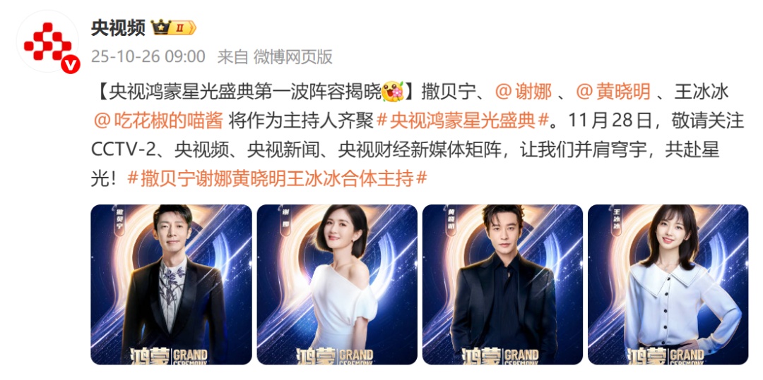 10月26日上午9時(shí),央視頻微博發(fā)布消息:撒貝寧、 謝娜、黃曉明、王冰冰將作為主持人齊聚央視?shū)櫭尚枪馐⒌洹?1月28日,敬請(qǐng)關(guān)注CCTV-2、央視頻、央視新聞、央視財(cái)經(jīng)新媒體矩陣,讓我們并肩穹宇,共赴星光!