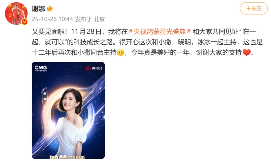 隨后,謝娜微博也發(fā)文證實(shí)了此消息:又要見(jiàn)面啦!11月28日,我將在央視?shū)櫭尚枪馐⒌浜痛蠹夜餐?jiàn)證“在一起,就可以”的科技成長(zhǎng)之路。很開(kāi)心這次和小撒,曉明,冰冰一起主持,這也是十二年后再次和小撒同臺(tái)主持