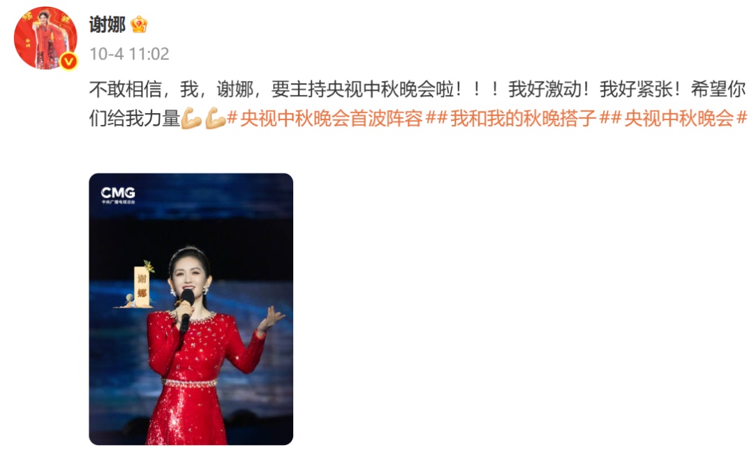 10月4日,央視秋晚主持人正式官宣后,謝娜就曾發(fā)布微博表示“不敢相信,我,謝娜,要主持央視中秋晚會(huì)啦!!我好激動(dòng)!我好緊張!希望你們給我力量!”