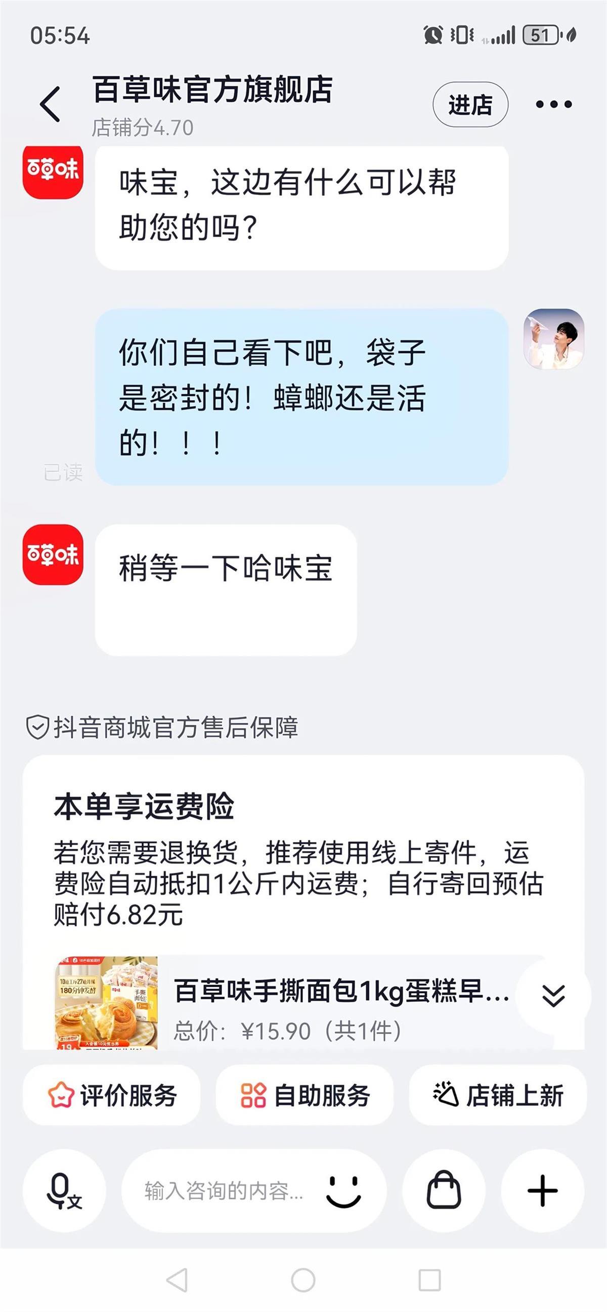 有網(wǎng)友在評論區(qū)質(zhì)疑此事,認(rèn)為蟑螂在包裝完好的面包袋中不可能存活,懷疑該事件真?zhèn)巍I鲜鱿M(fèi)者在回復(fù)網(wǎng)友評論時,多次強(qiáng)調(diào)是真事,已向商家反饋,正在進(jìn)行溝通。極目新聞記者嘗試聯(lián)系該消費(fèi)者,但一直沒有回復(fù)。