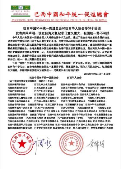 中新網(wǎng)圣保羅10月25日電 巴西中國和平統(tǒng)一促進(jìn)總會(huì)和巴西華人協(xié)會(huì)等68個(gè)僑團(tuán)24日在巴西圣保羅發(fā)表共同聲明:設(shè)立臺灣光復(fù)紀(jì)念日意義重大,祖國統(tǒng)一勢不可擋。