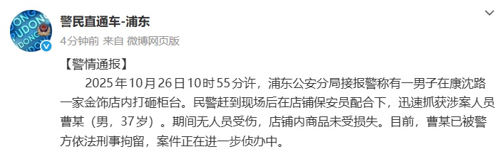 2025年10月26日10時55分許,浦東公安分局接報警稱有一男子在康沈路一家金飾店內打砸柜臺。民警趕到現場后在店鋪保安員配合下,迅速抓獲涉案人員曹某(男,37歲)。期間無人員受傷,店鋪內商品未受損失。目前,曹某已被警方依法刑事拘留,案件正在進一步偵辦中。