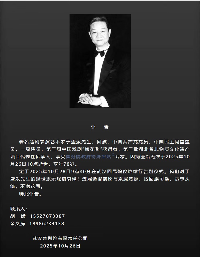 定于2025年10月28日9點(diǎn)30分在武漢回民殯儀館舉行告別儀式。我們對于盛樂先生的逝世表示深切哀悼!遵照逝者遺愿與家屬意愿,按回族習(xí)俗,喪事從簡,不送花圈。