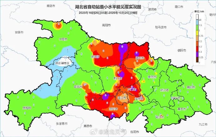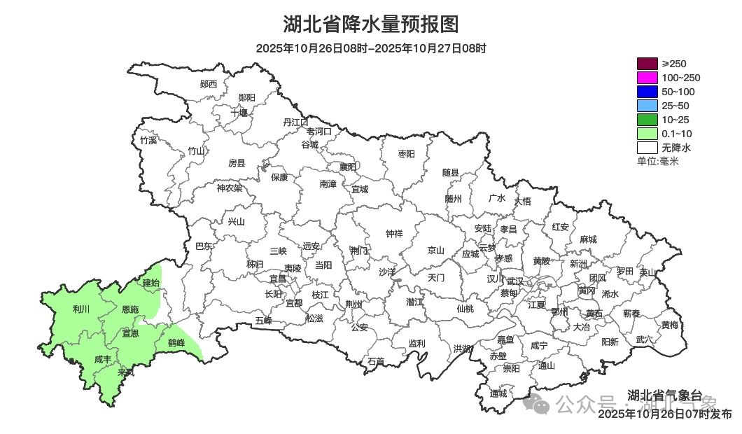 10月26日08時-27日08時,全省多云,其中鄂西南局地有小雨。早晨省內中西部局地有霧。最高氣溫17~22℃,最低氣溫8~13℃,偏北風2到3級。