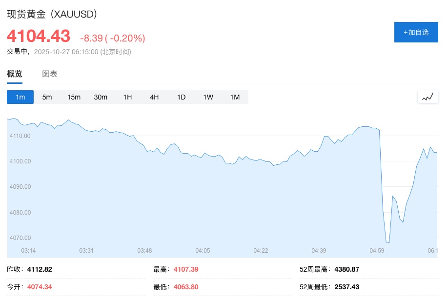 10月27日,現貨黃金跳空低開后,現重新站上4100美元/盎司,跌幅縮窄至0.3%,此前一度跌1%。