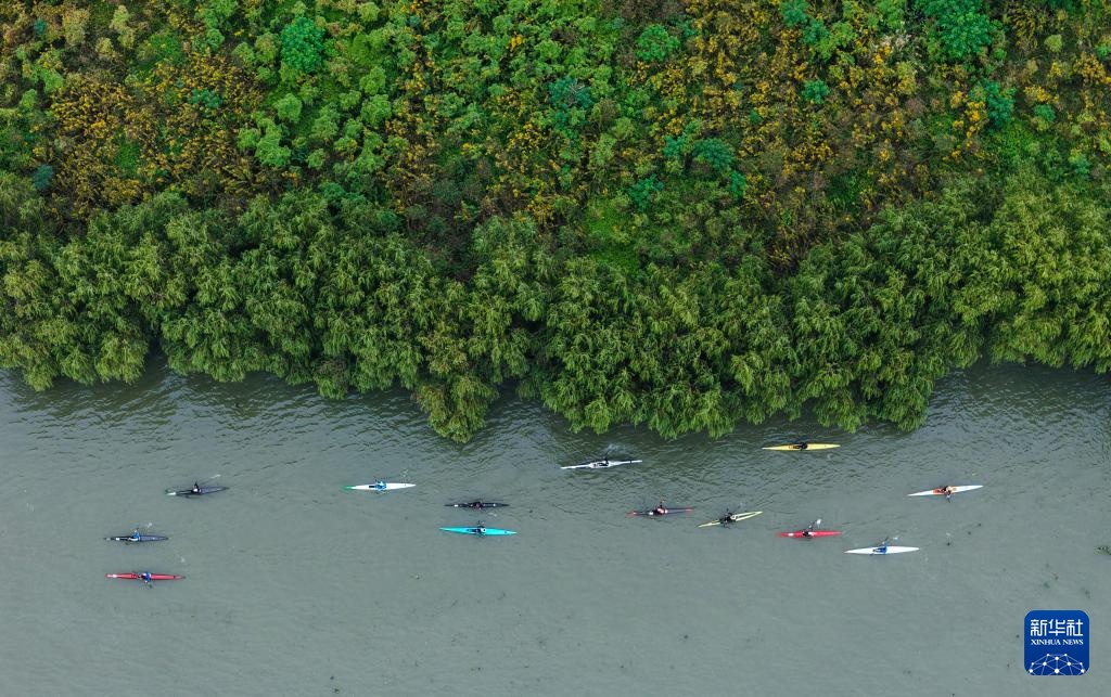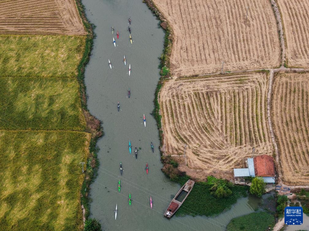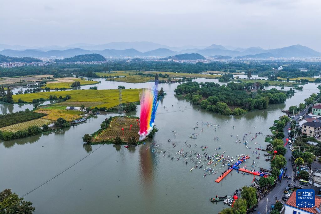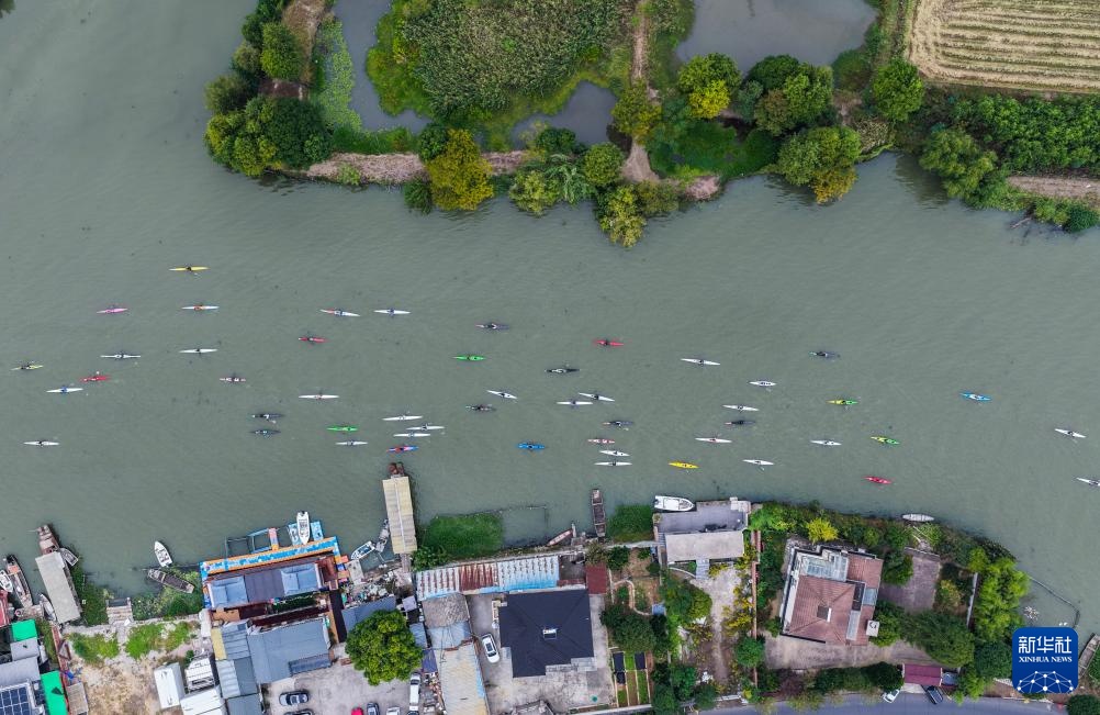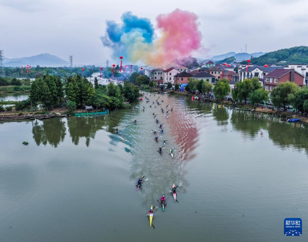 10月26日,參加皮劃艇比賽的選手從起點出發(無人機照片)。