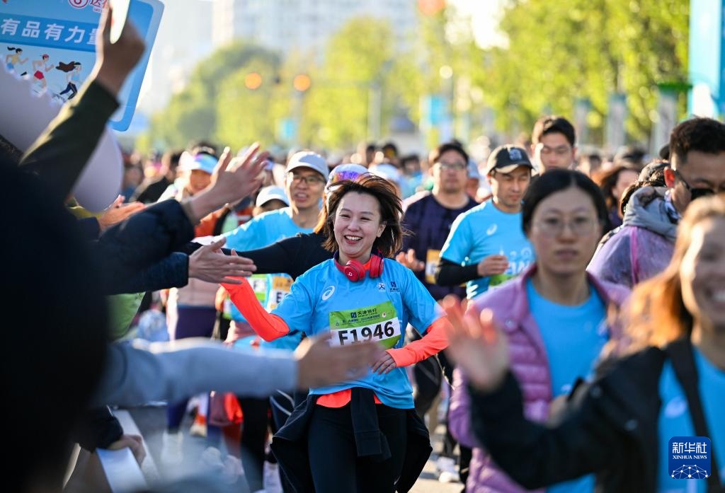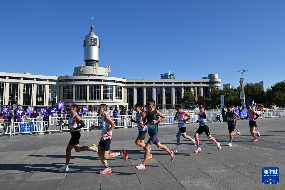 10月26日,參賽選手在比賽中跑過天津站前廣場。