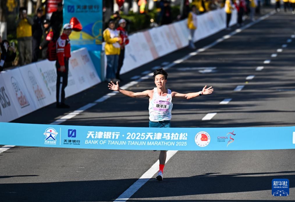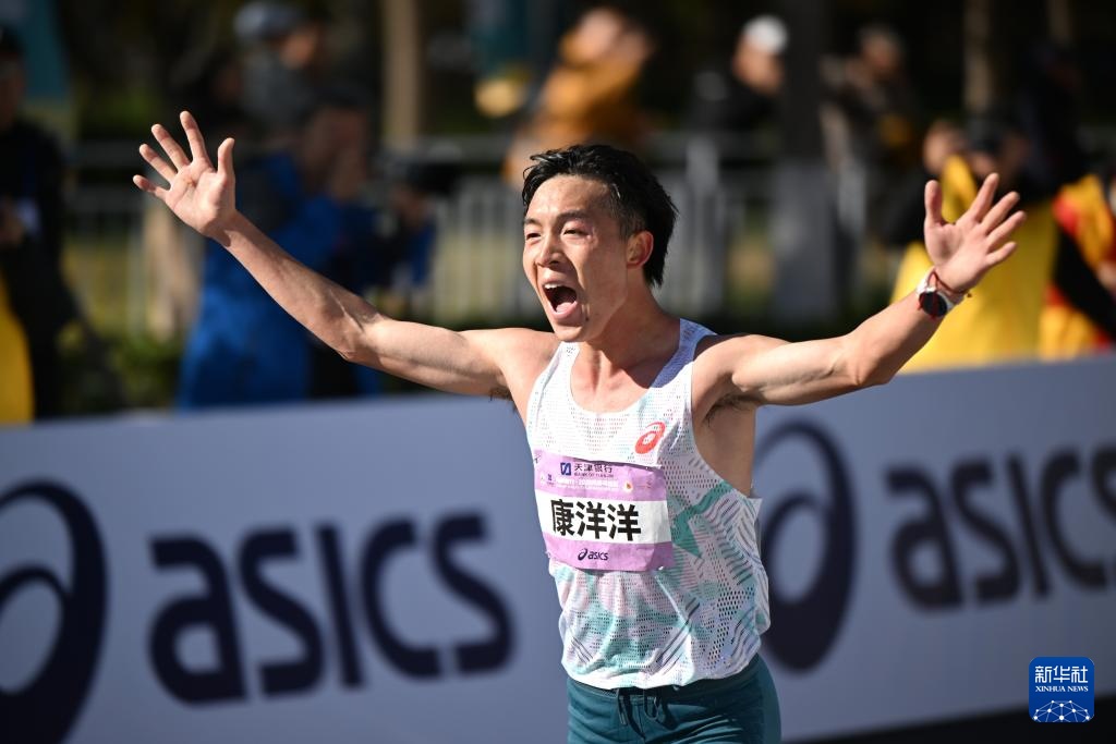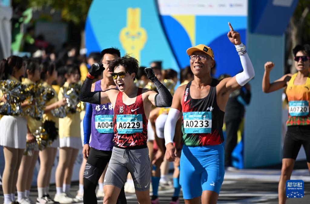 10月26日,參賽選手康洋洋沖過終點線后慶祝。最終,他以2小時17分06秒的成績獲得男子組冠軍。